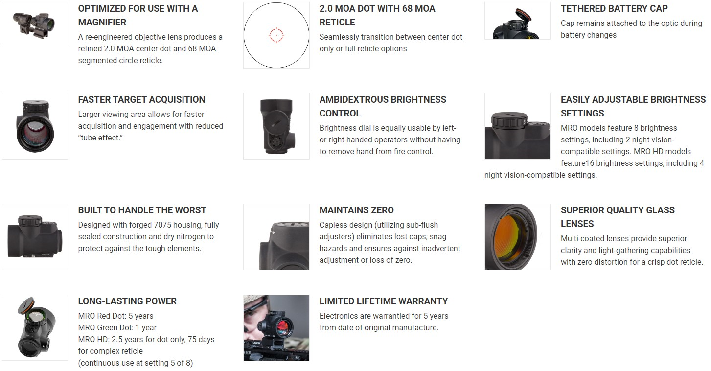 The MRO HD is optimized for use with a magnifier, with a re-engineered objective lens to produce a refined 2.0 MOA center dot surrounded by a 68 MOA segmented circle reticle. The ambidextrous reticle and brightness control allows the user to choose between a full reticle or center dot only.